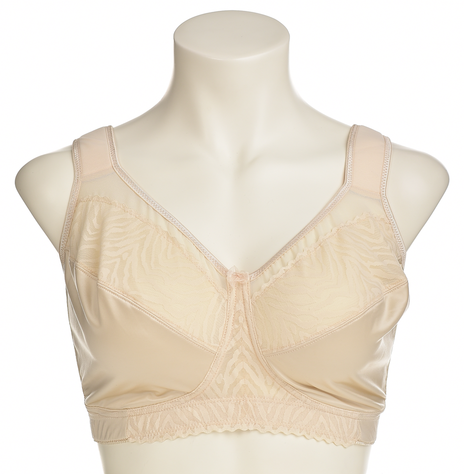 Бежов комфортен сутиен с пълно покритие, меки чашки и широки подплатени презрамки. Деликатен десен, еластична долна лента и фина дантелена декорация за стабилна и комфортна поддръжка. Много удобен!!