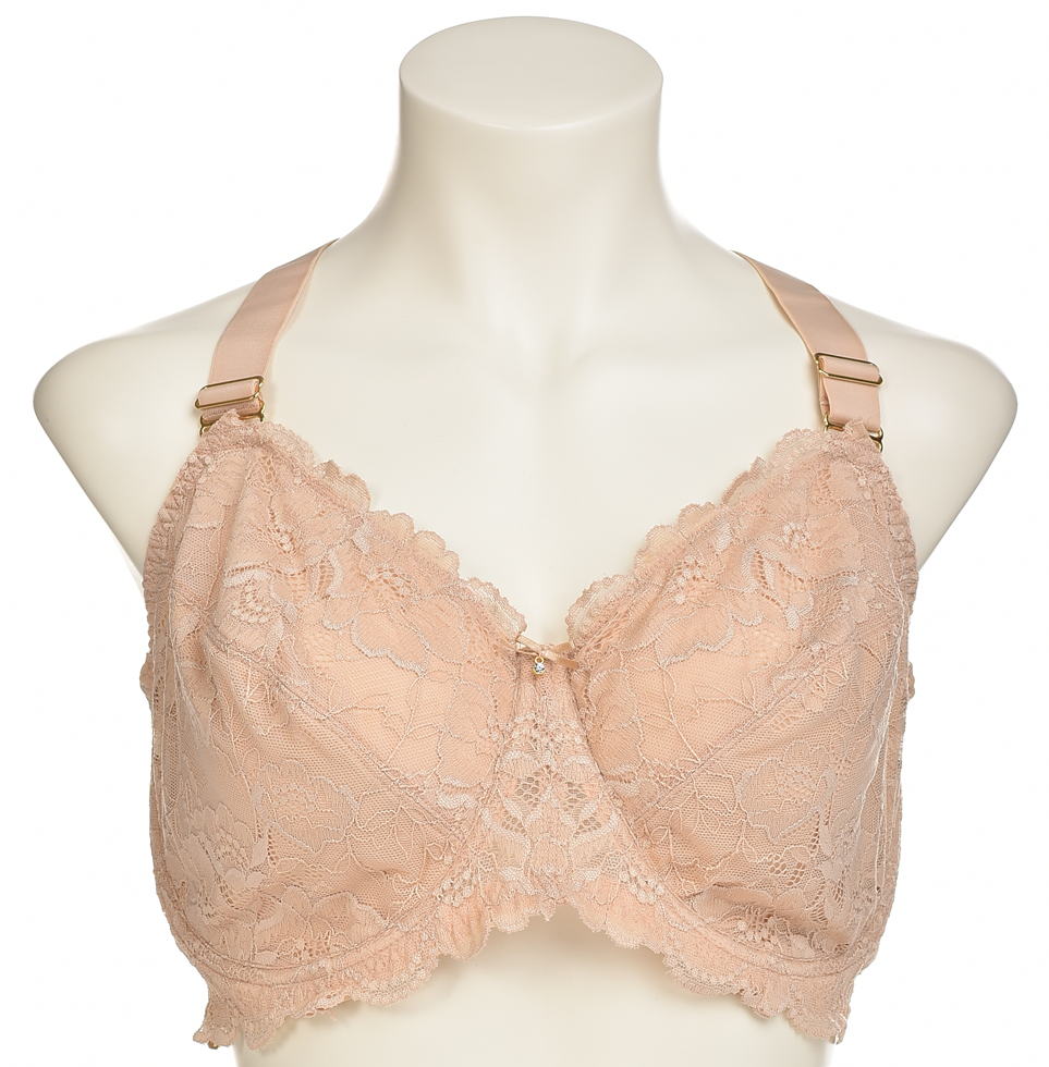 Нежен дантелен сутиен в прасковено-нюд тон, с оформени чашки и банели за стабилна поддръжка, широки регулируеми презрамки и фина централна декорация. Комфортен и стилен за всеки ден. Перфектна форма.