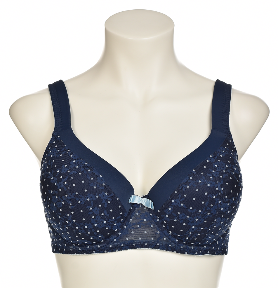 Елегантен тъмносин сутиен с дискретни бели точки и деликатна дантела. Меки чашки и широки регулируеми презрамки осигуряват комфорт и стабилна поддръжка. Декоративна светлосиня панделка отпред. Удобен.