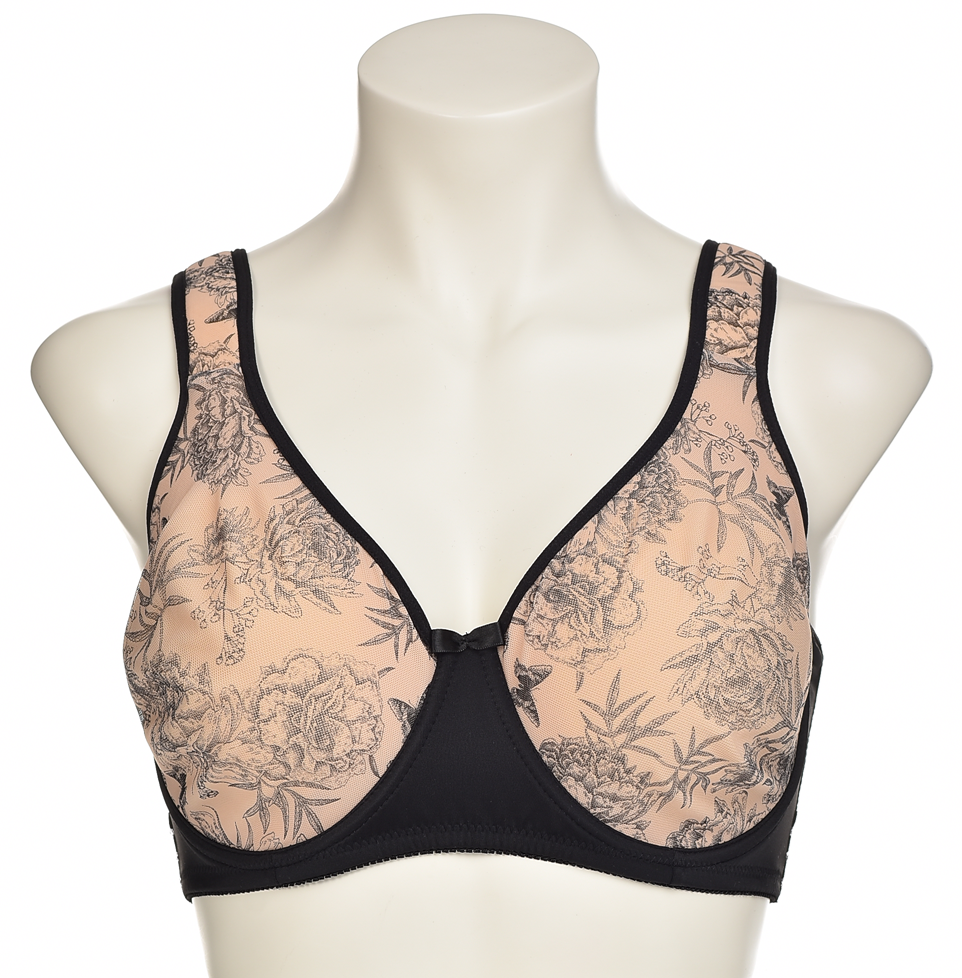 Нежен и елегантен сутиен с банели, флорален принт в бежово и черно. Оформени, меки чашки, широки регулируеми презрамки и стабилна поддържаща лента за целодневен комфорт. Подходящ за всеки ден и вечер.