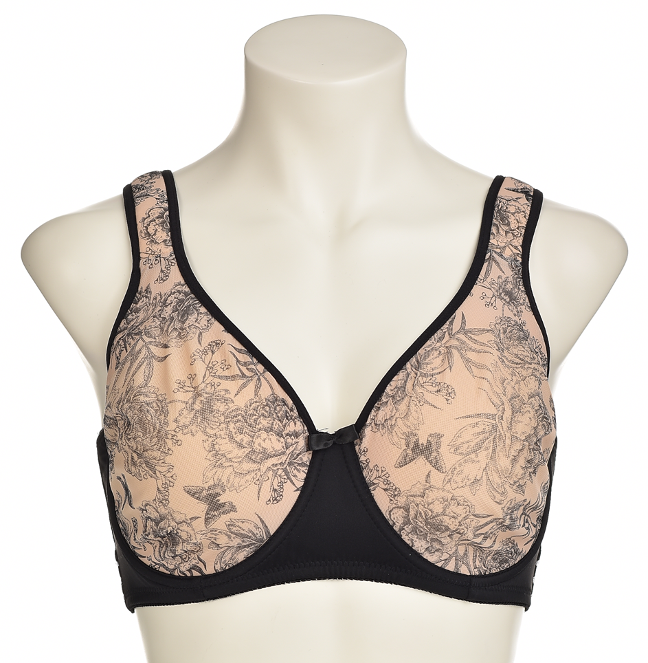 Елегантен сутиен с меки подплатени чашки и банели, бежово-черен флорален десен, широки регулиращи се презрамки и удобна долна лента. Подходящ за ежедневна и по-официална употреба. Лек и дишащ плат.
