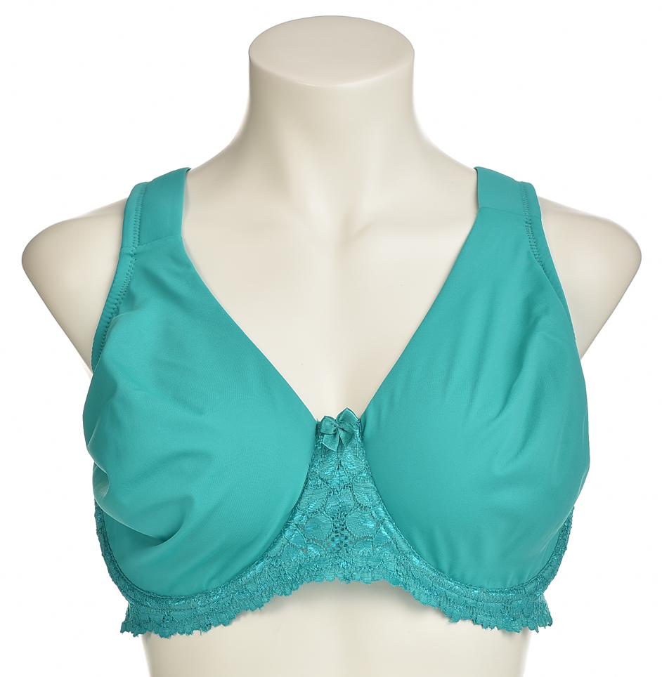 Тюркоазен сутиен с оформени чашки и банел, широки подплатени презрамки, дантела под бюста и малка панделка отпред. Комфортен, стабилен и подходящ за ежедневно носене. Идеален избор за всички сезони.