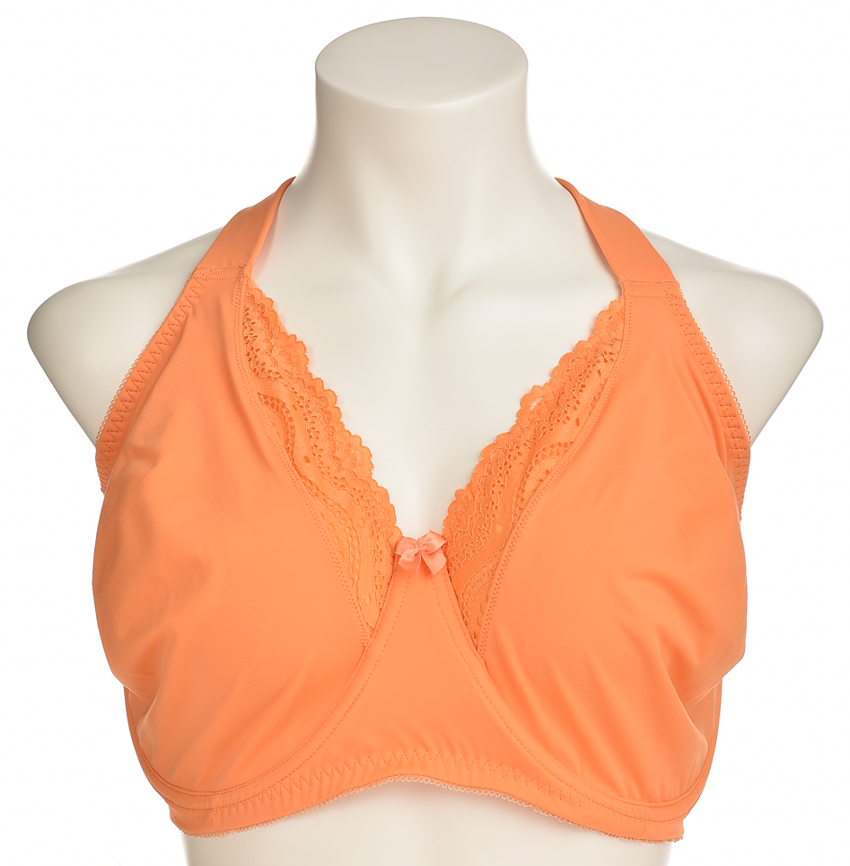 Елегантен прасковен сутиен с халтер дизайн и меки чашки с тел, декориран с фина дантела и малка панделка. Осигурява удобна опора и женствен силует, идеален за ежедневна употреба. Има различни размери.