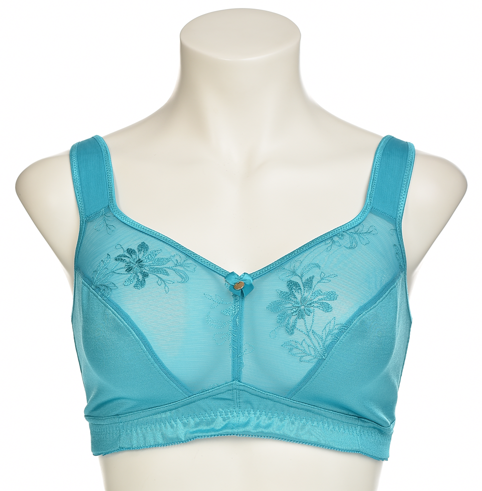 Комфортен безжичен сутиен в тюркоазен със фина мрежа и цветна бродерия, широки подплатени презрамки и еластична долна лента за надеждна опора. Ежедневен и стилен избор. Подходящ за всякакви поводи!!!