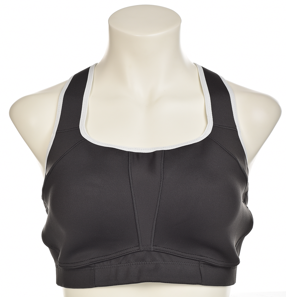 Спортен сутиен в черно с бели кантове. Има плътна конструкция, предлагаща подкрепа и удобство по време на тренировка. Изработен е от дишаща и мека материя. Подходящ за активен начин на живот.