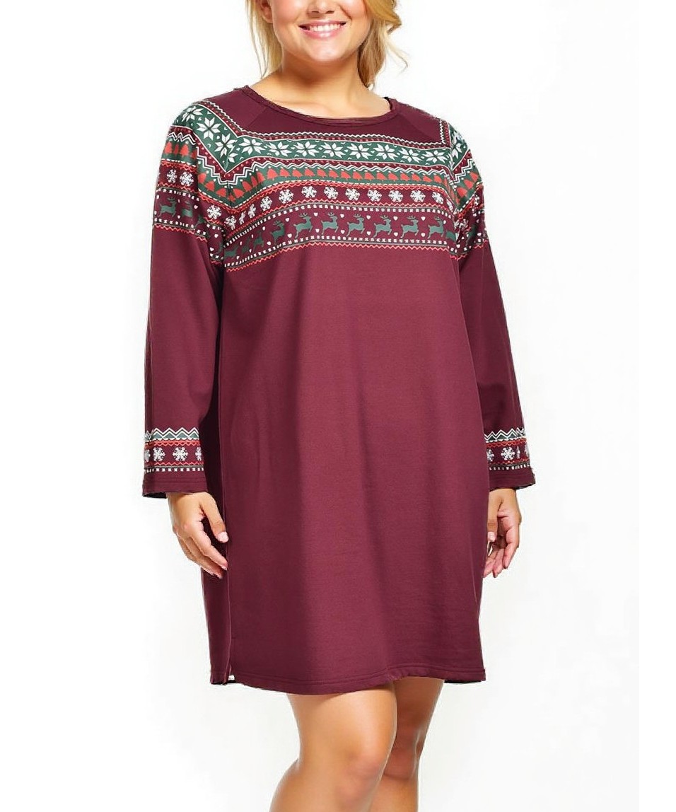 Ватирана памучна рокля в бордо, с дълги ръкави и коледни-скандинавски мотиви на гърдите и ръкавите. Удобна, мека и топла за ежедневие и домашен уют. Дължина до коляното. Подходяща за подарък и стилна.