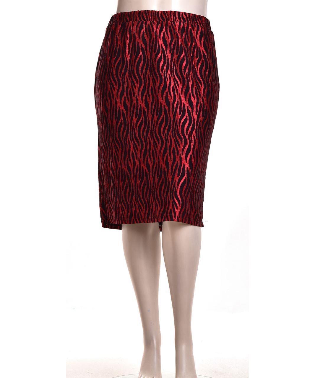 Елегантна молив-пола до коляното в бордо и черно с абстрактен вълнообразен десен. Еластичен колан, прав силует, подходяща за офис и вечерни тоалети. Мека, леко еластична материя. С наличност в S-XL.