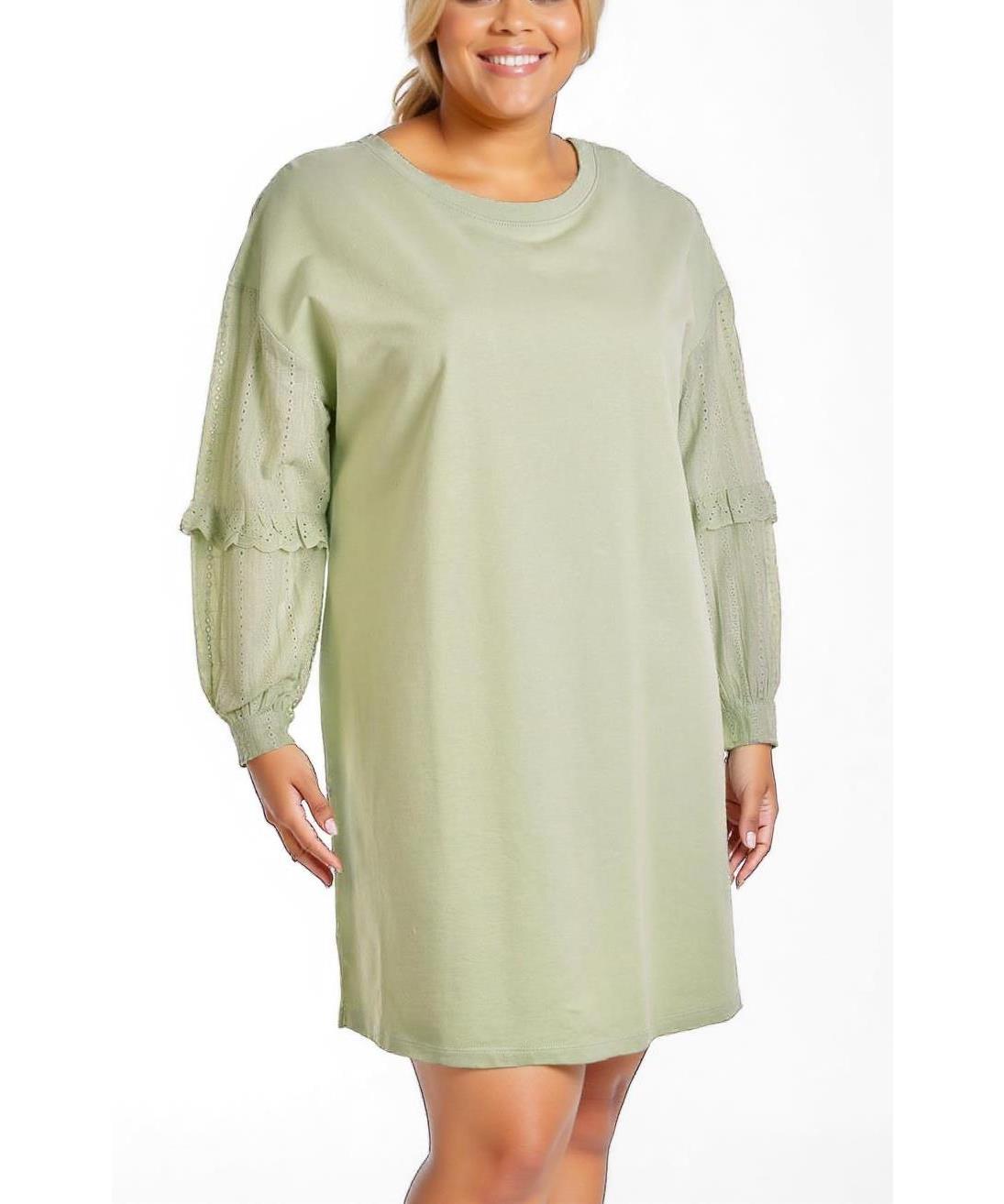 Свободна рокля от 100% памук в светло зелен нюанс. Кръгло деколте, ефирни ръкави с дантелени детайли и набор при маншета. Удобна, дишаща и практична за ежедневие и пролетни дни. Машинно пране, сушене.