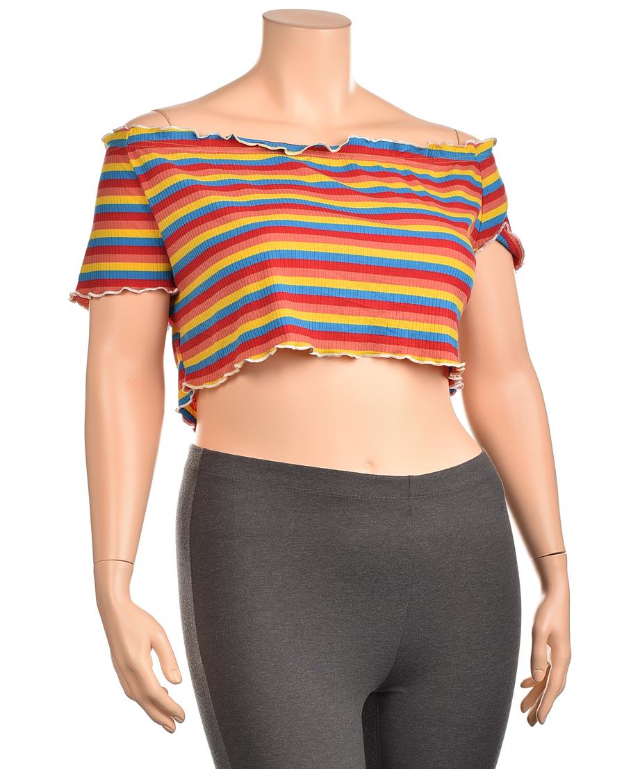 Дамска блуза с открити рамене, изработена от цветен плат на райета в синьо, жълто, червено и зелено. Моделът е с къс, вълнообразен подгъв, придаващ закачлив вид. Подходяща за casual визия.