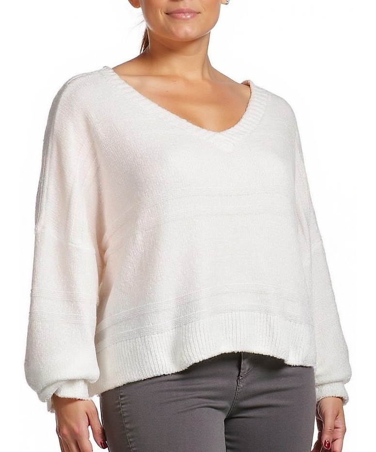 Елегантна дамска блуза/пуловер в бяло, с V-образно деколте и обемни ръкави. Мека, плетена материя, разкроена кройка за комфорт. Идеална за ежедневие и стилни комбинации. Лека, стилна и лесна за поддръжка