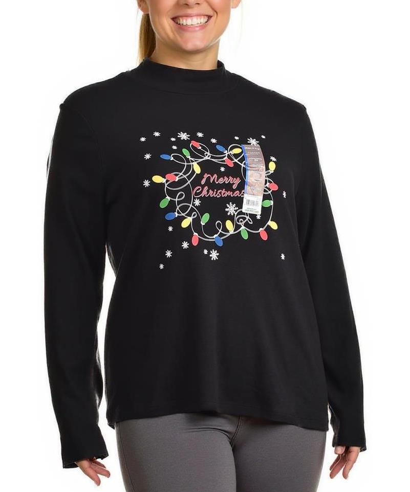 Черна дамска памучна блуза с дълъг ръкав и висока поло яка. Мека и удобна, свободна кройка, с коледен принт "Merry Christmas" и цветни лампички. Подходяща за всекидневно носене. Лесна за поддръжка.Да!