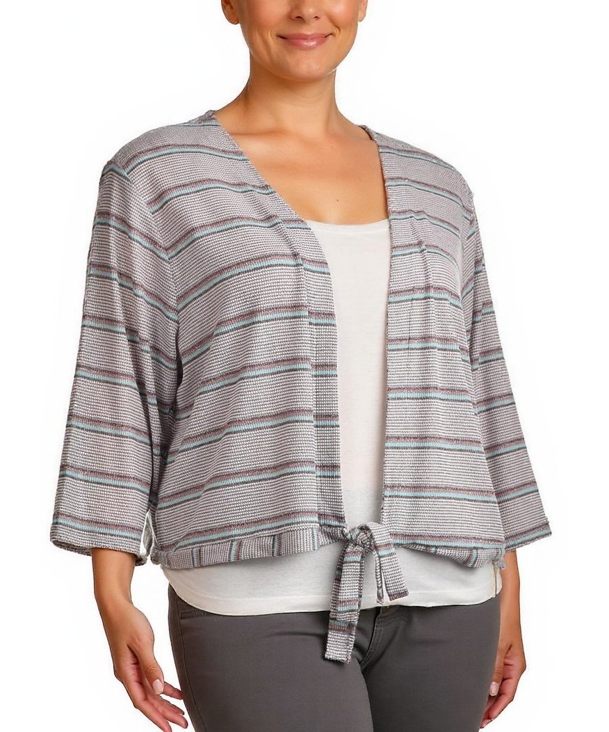Елегантна дамска жилетка с хоризонтални райета, къси ръкави 3/4 и отворена предна част с плитка за завързване. Лека, мека материя, идеална за ежедневие и лесно комбиниране с всякакви тоалети. Подходящ.