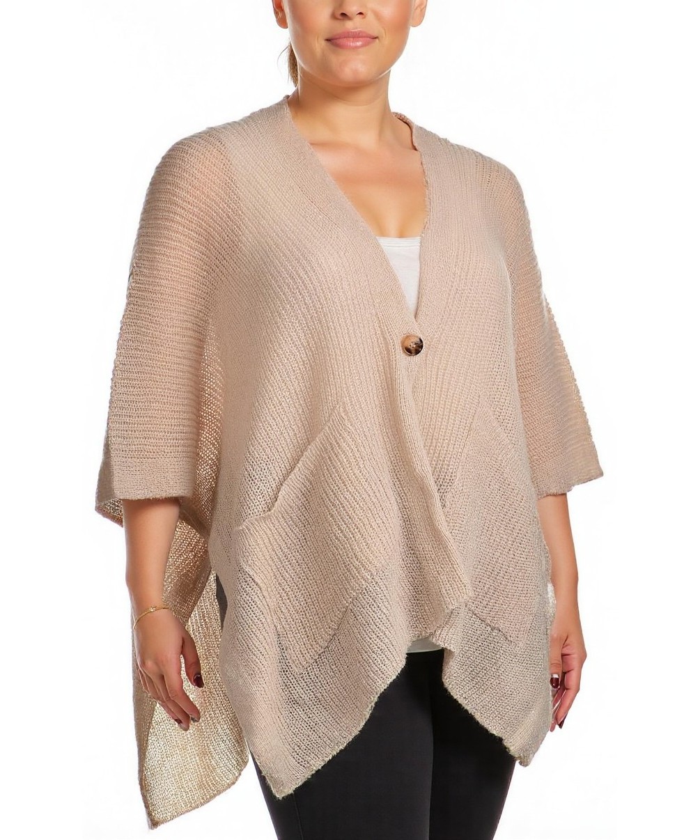 Лека дамска жилетка-пончо в бежово, с едно копче и джобове. Свободен силует, мека плетка и три-четвърт ръкав. Идеална за ежедневно и елегантно съчетание през преходните сезони. Налична в различни размери