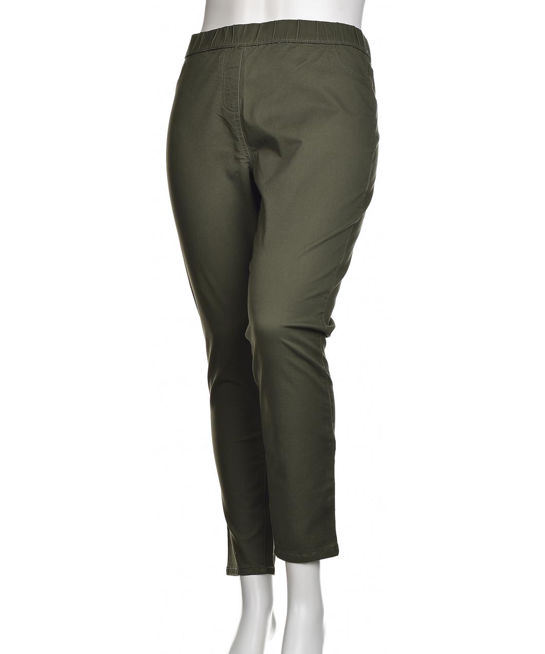 Дамски панталон от памук, в оливено-каки цвят. Тесен силует, еластичен колан за комфорт, мека, дишаща материя. Идеален за ежедневие и пътуване — стилен и практичен избор Лесна поддръжка, перфектно пас