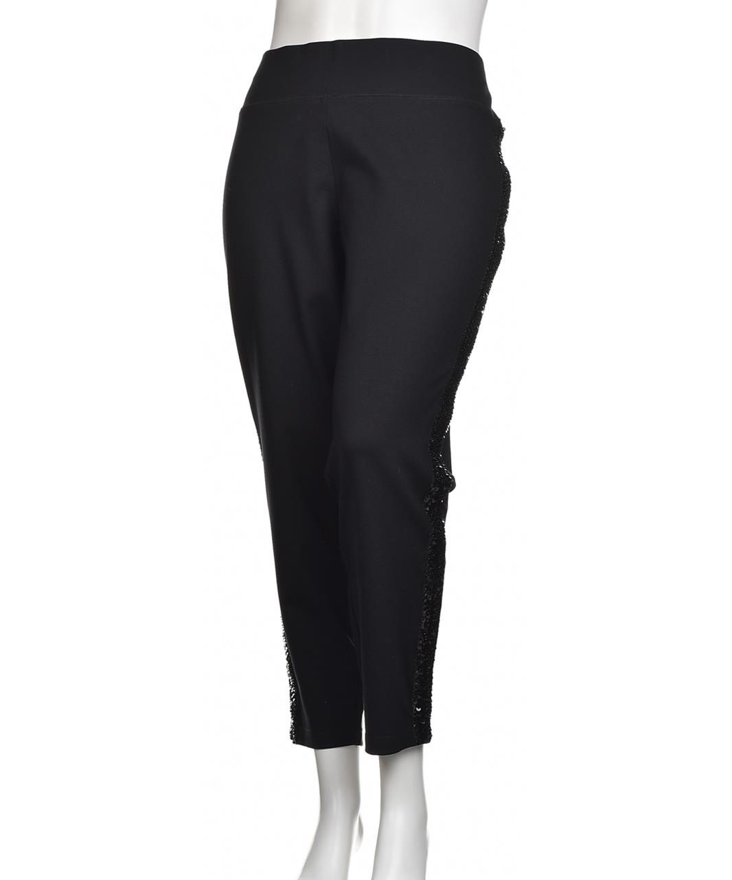 Елегантен дамски панталон от вискоза в черно. Тесен силует, еластична талия и дискретна странична декорация с блясък. Комфортен и подходящ за офис и вечерни изяви. Лесни за поддръжка, меки и дишащи.!!