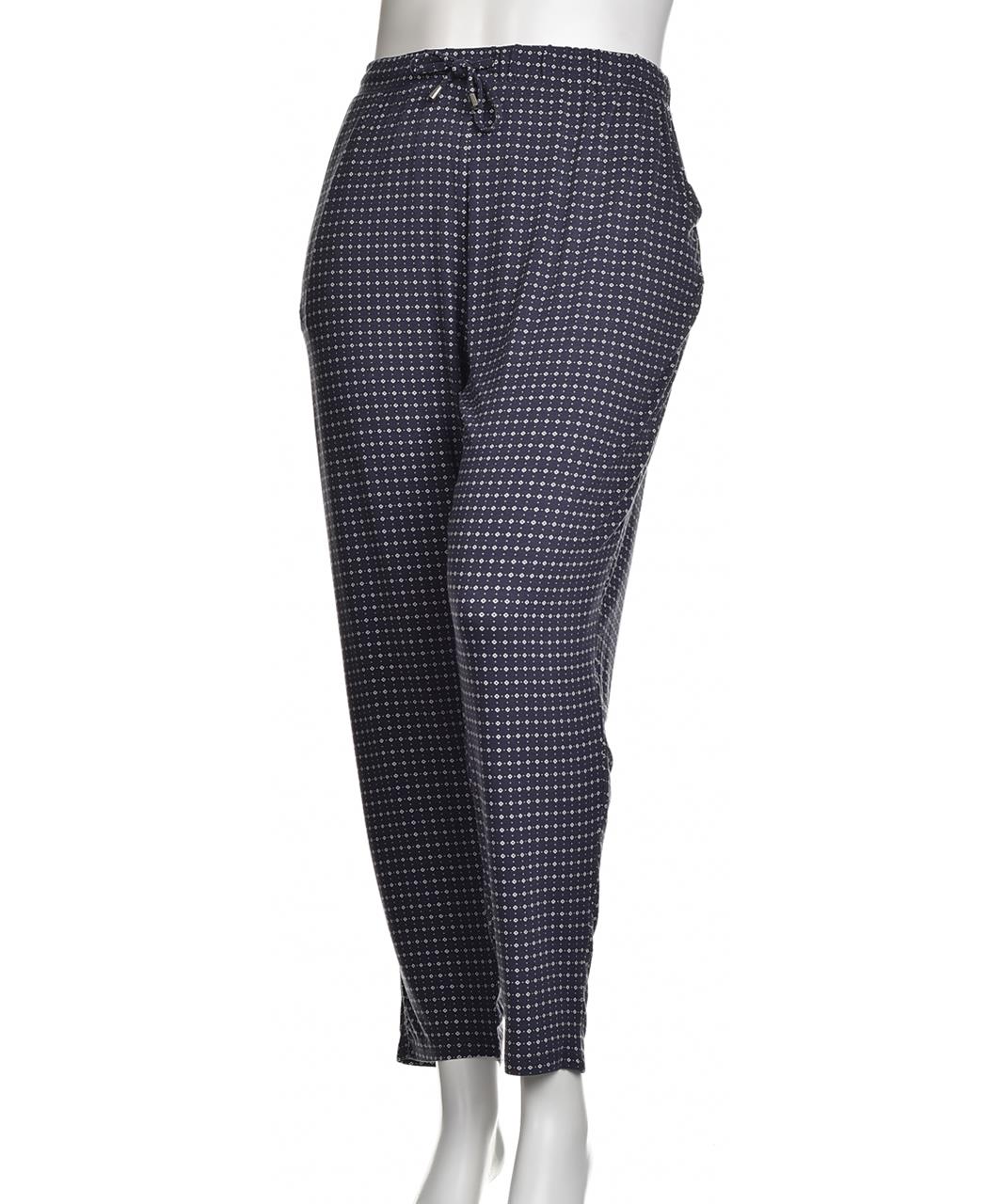 Елегантен дамски панталон от вискоза със свободен силует. Тъмносин десен на ситни бели точки, ластична талия с връзка и удобни джобове. Лек и приятен за ежедневно носене. Подходящ за работа и уикенд.