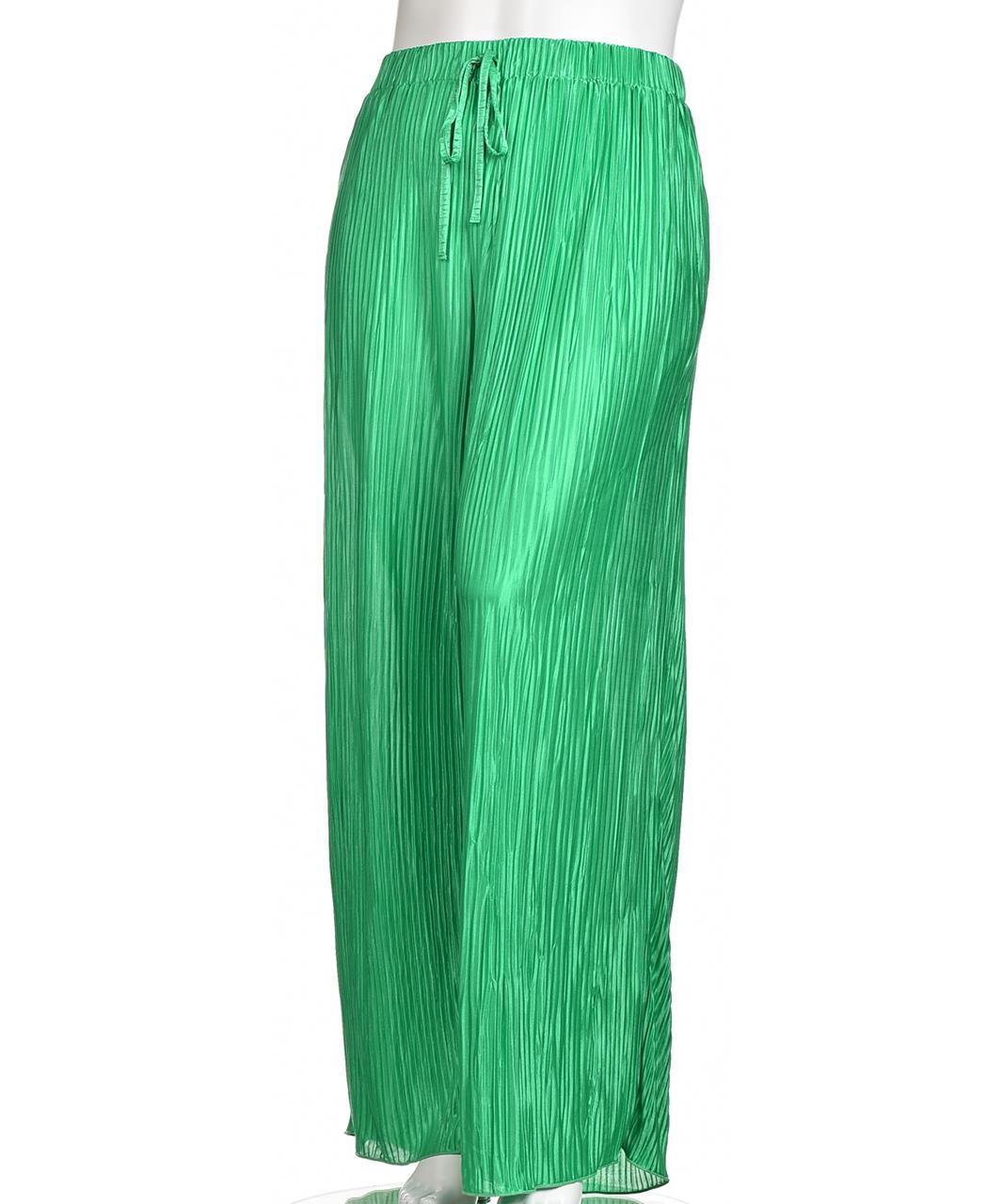 Стилният дамски панталон е в ярко зелен цвят с широки крачоли. Той е с еластична талия и връзки за допълнително удобство. Леката и ефирна материя го прави подходящ за ежедневно носене през топлите месеци.