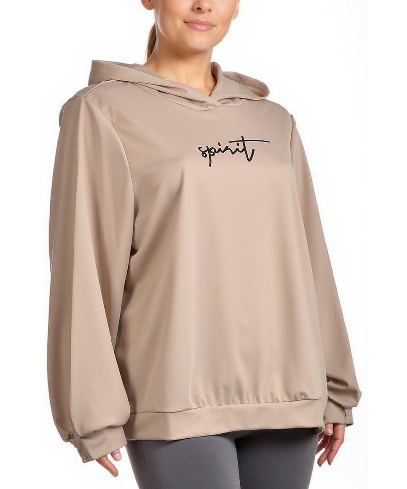 Дамски суичър в мек бежов нюанс с качулка и свободна кройка. Балонени ръкави, еластични маншети и подгъв, декор с надпис „spirit“. Удобен, стилен и подходящ за ежедневно носене. Лесна грижа и запазване