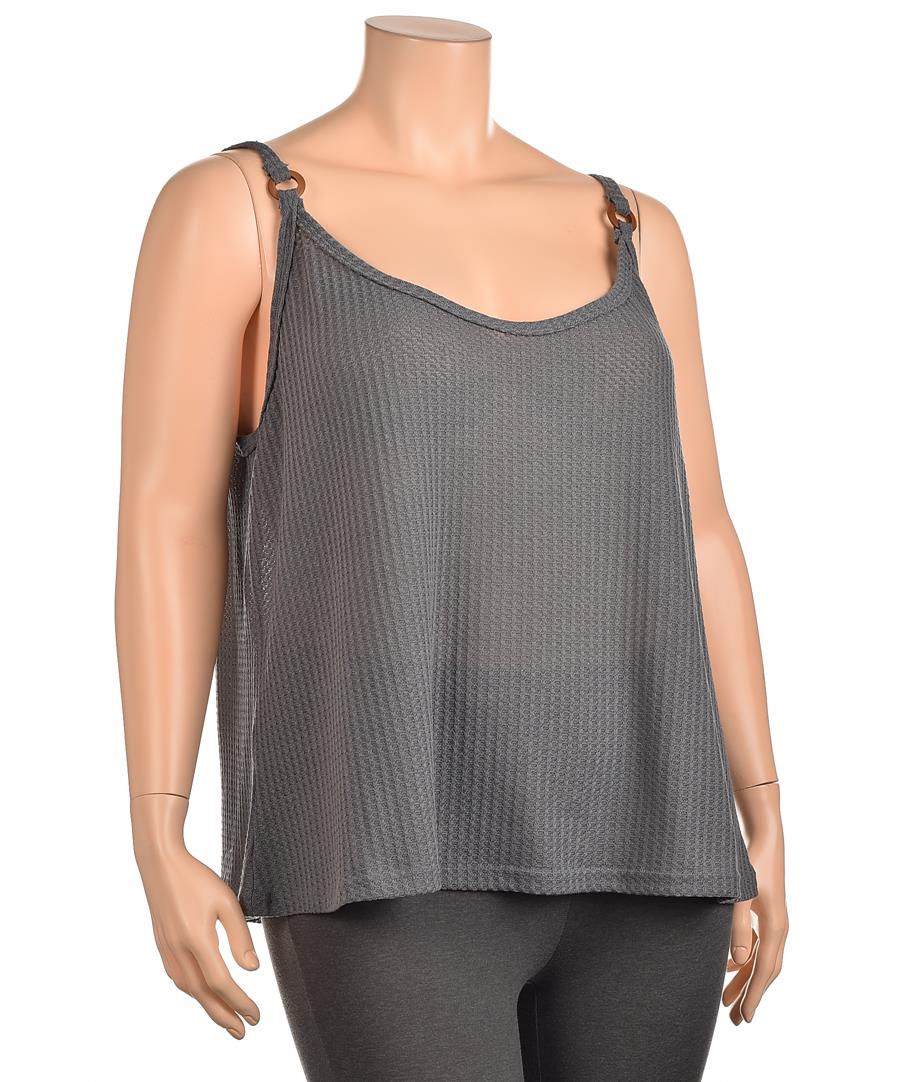 Дамският топ е сив, изработен от лека, дишаща материя с текстура. Има широки презрамки с декоративни халки и свободна кройка, подходяща за ежедневно носене. Идеален за летния сезон.