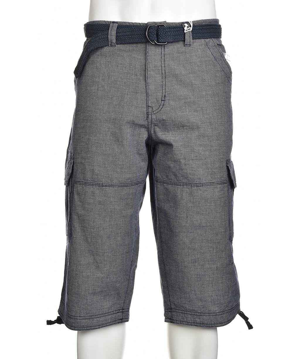 Мъжки къс панталон в сив цвят с класически дизайн и включен тъмен плетен колан. Има множество джобове, включително странични карго джобове. Подходящ за ежедневието, съчетавайки стил и удобство.