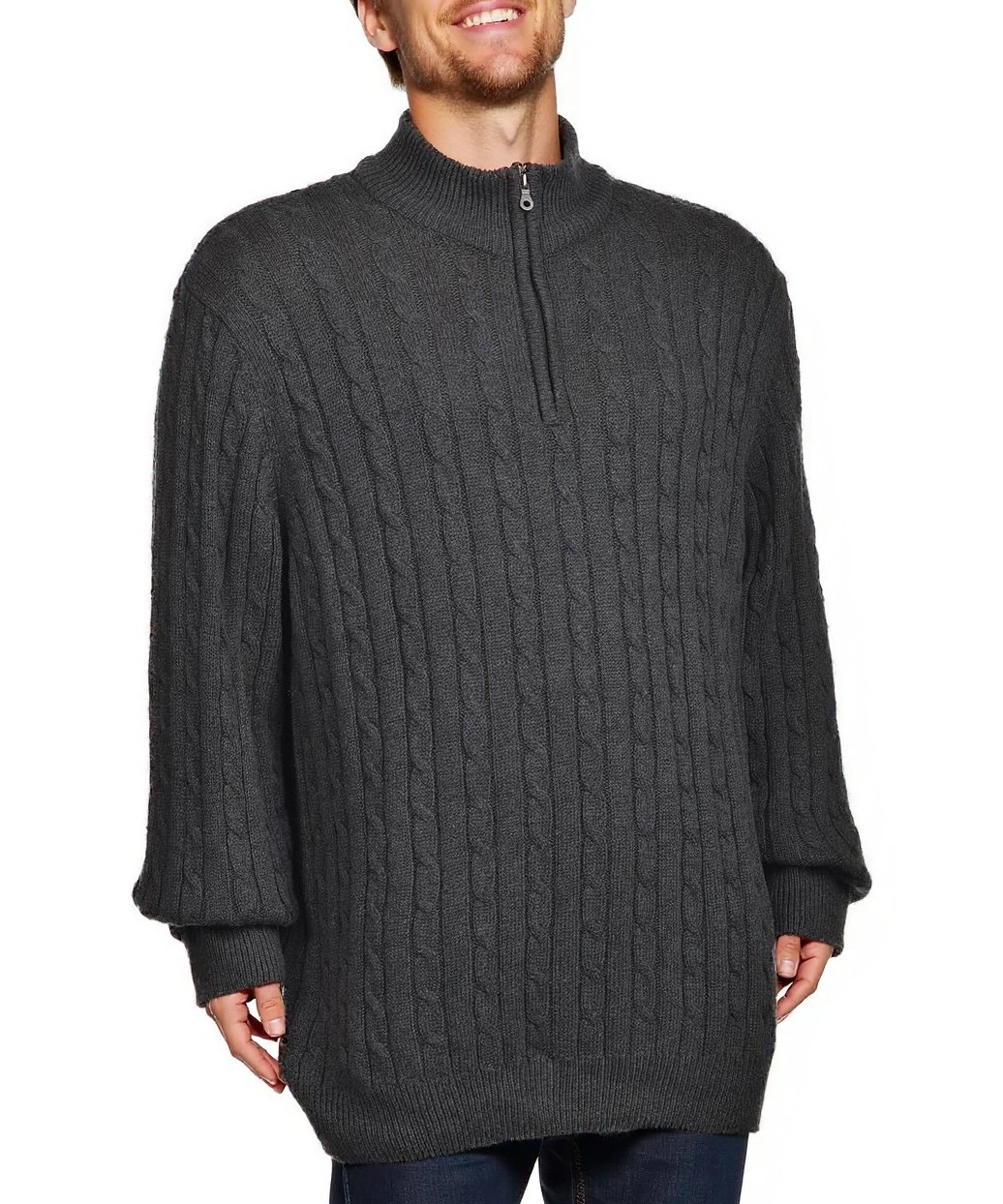 Мъжки памучен пуловер тъмносив, с релефна оплетка тип плитки, висок прав рипс шал-яка с цип до гърлото, дълги ръкави с ластик и удължен свободен силует. Комфортен и стилен избор. Подходящ за всеки ден