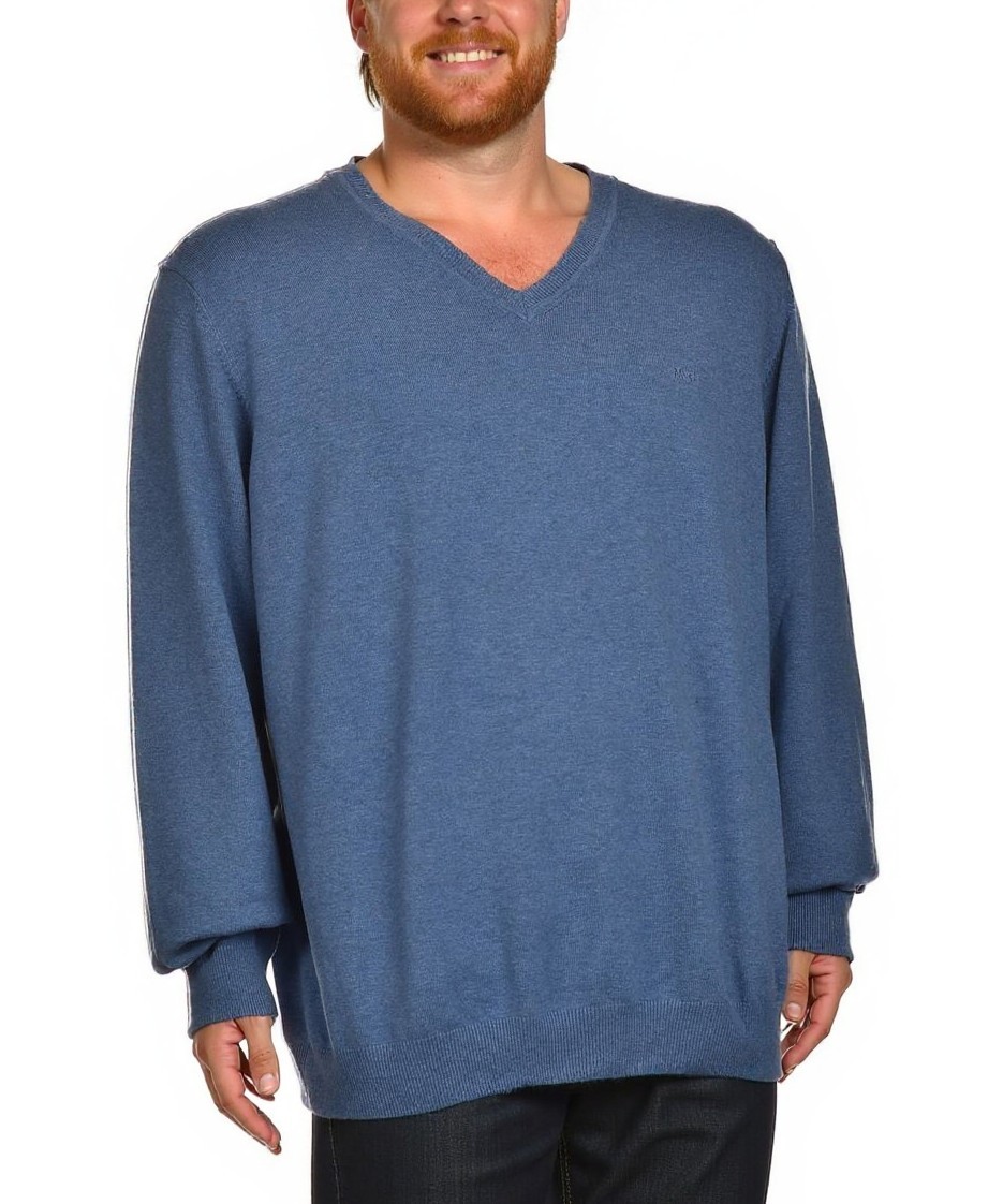 Мъжки памучен пуловер с V-образно деколте, мек и дишащ материал, класическа кройка и еластични ръкави и подгъв. Подходящ за ежедневие и по-елегантни комбинации. Достъпен в универсален син цвят. XL/XXL