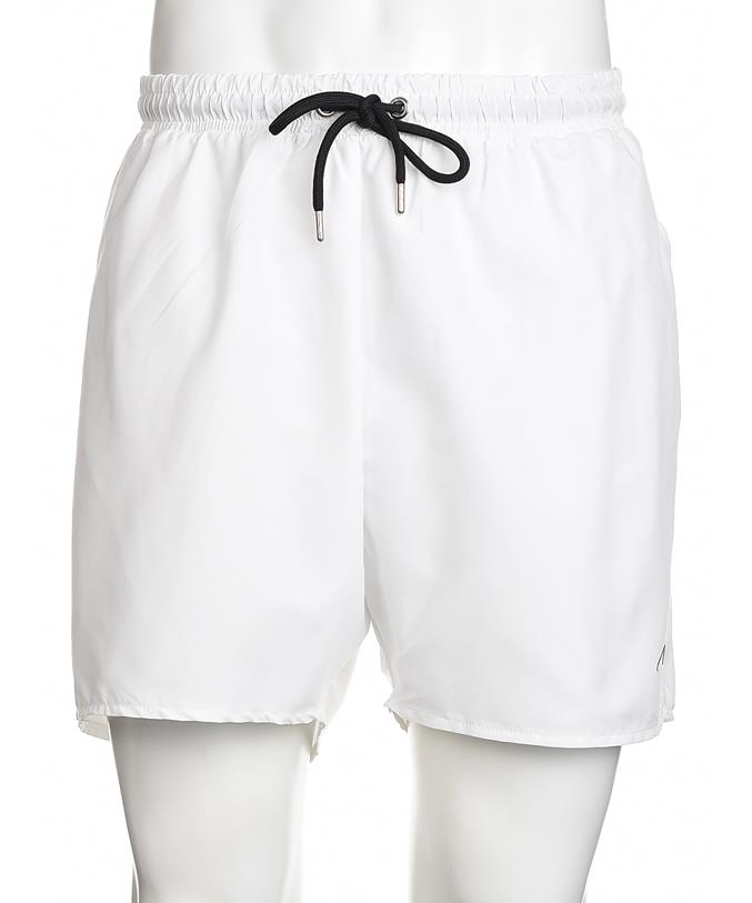Бели плувни шорти с регулируем ластичен колан и черни връзки за пристягане. Изработени от лека, бързосъхнеща материя, осигуряваща комфорт и свобода на движение по време на плуване.