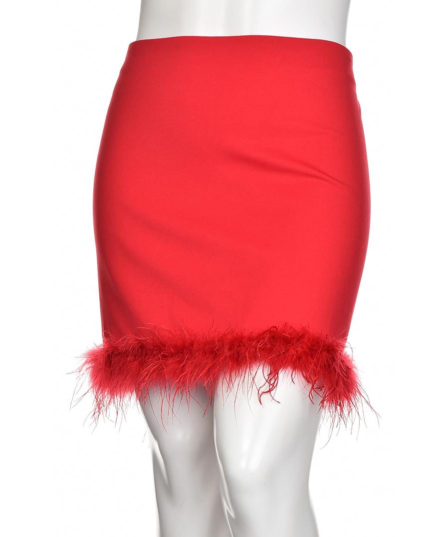 Елегантна червена пола с дължина до коляното, създадена за специални поводи. Характеризира се с изчистен дизайн, който подчертава силуета и привлича вниманието с ефектен пухен кант в долната част.