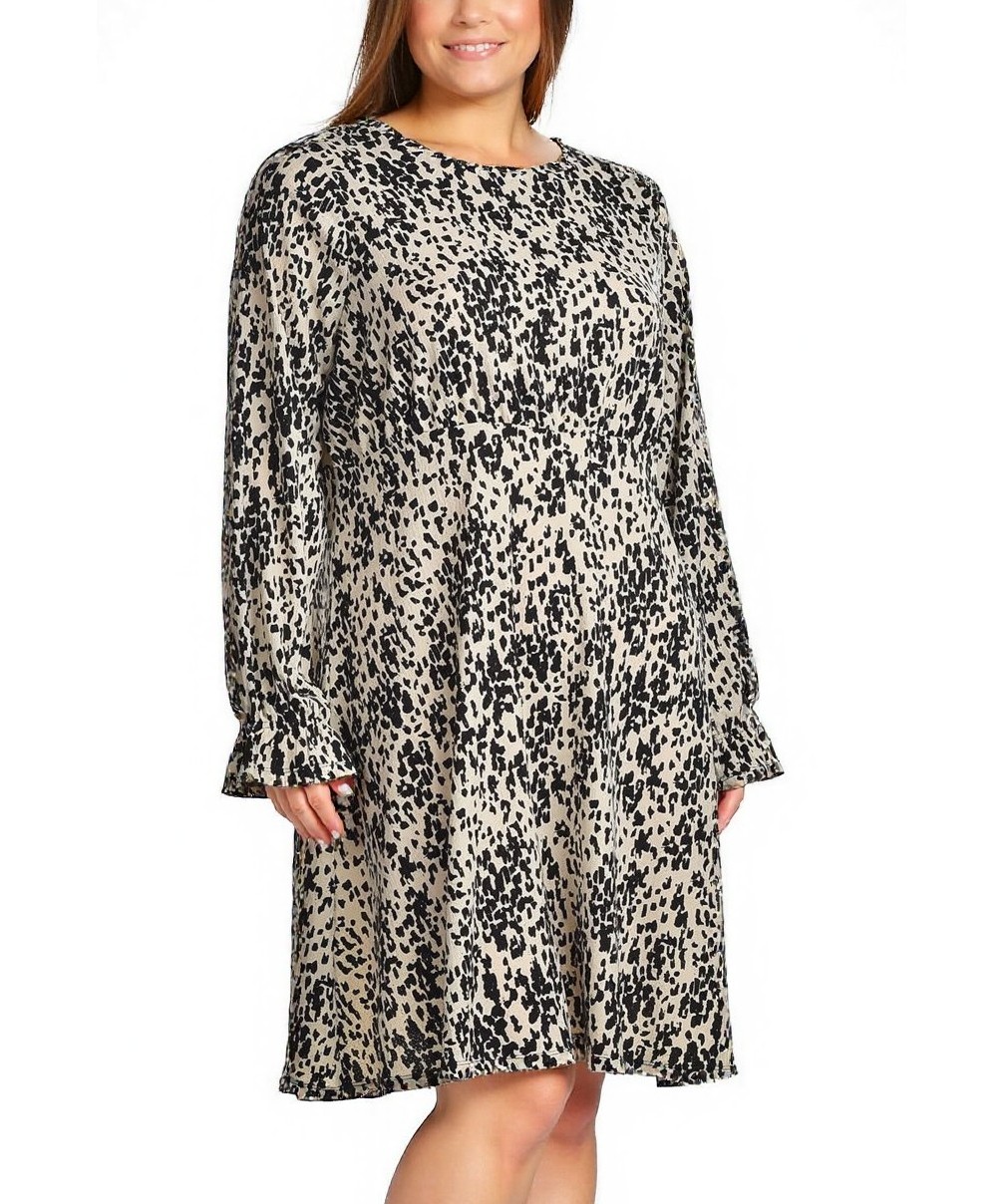 Елегантна дамска рокля с черно-бял принт, кръгло деколте, дълги ръкави със свободен маншет и разкроена пола до коляното. Комфортна, стилна и подходяща за всеки ден и по-празнични поводи. Идеален избор.